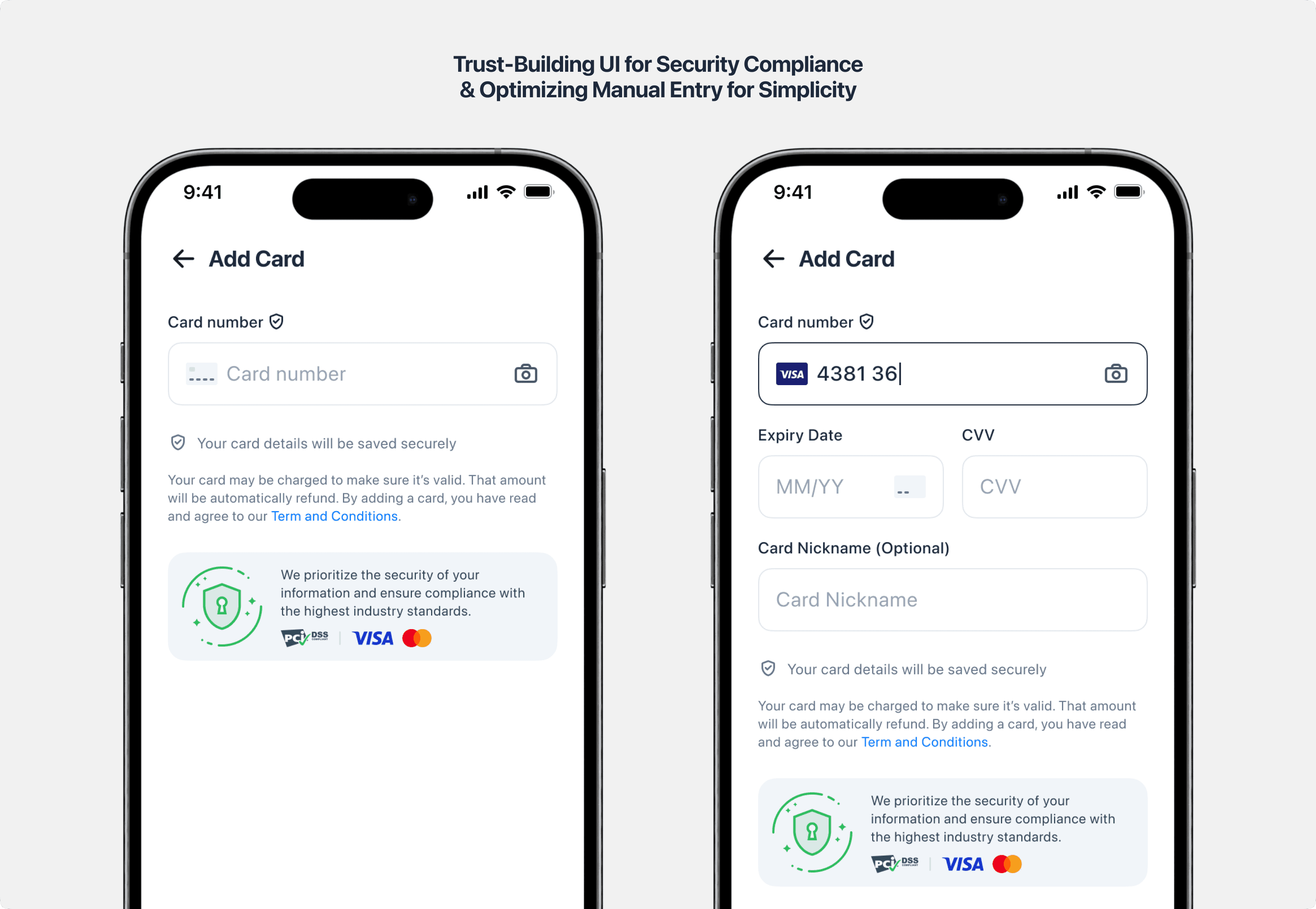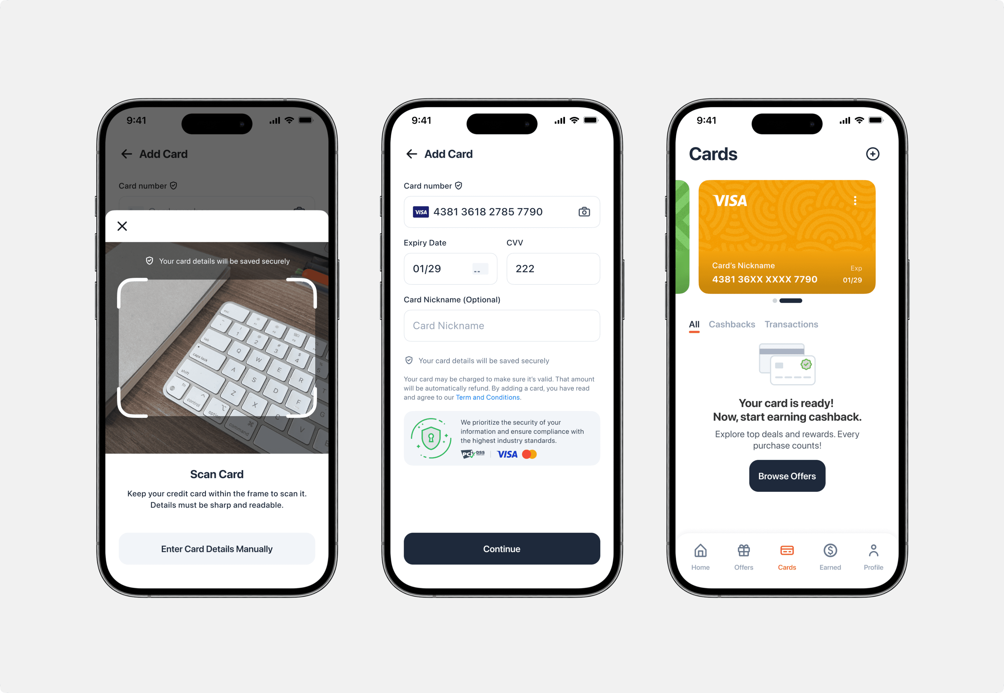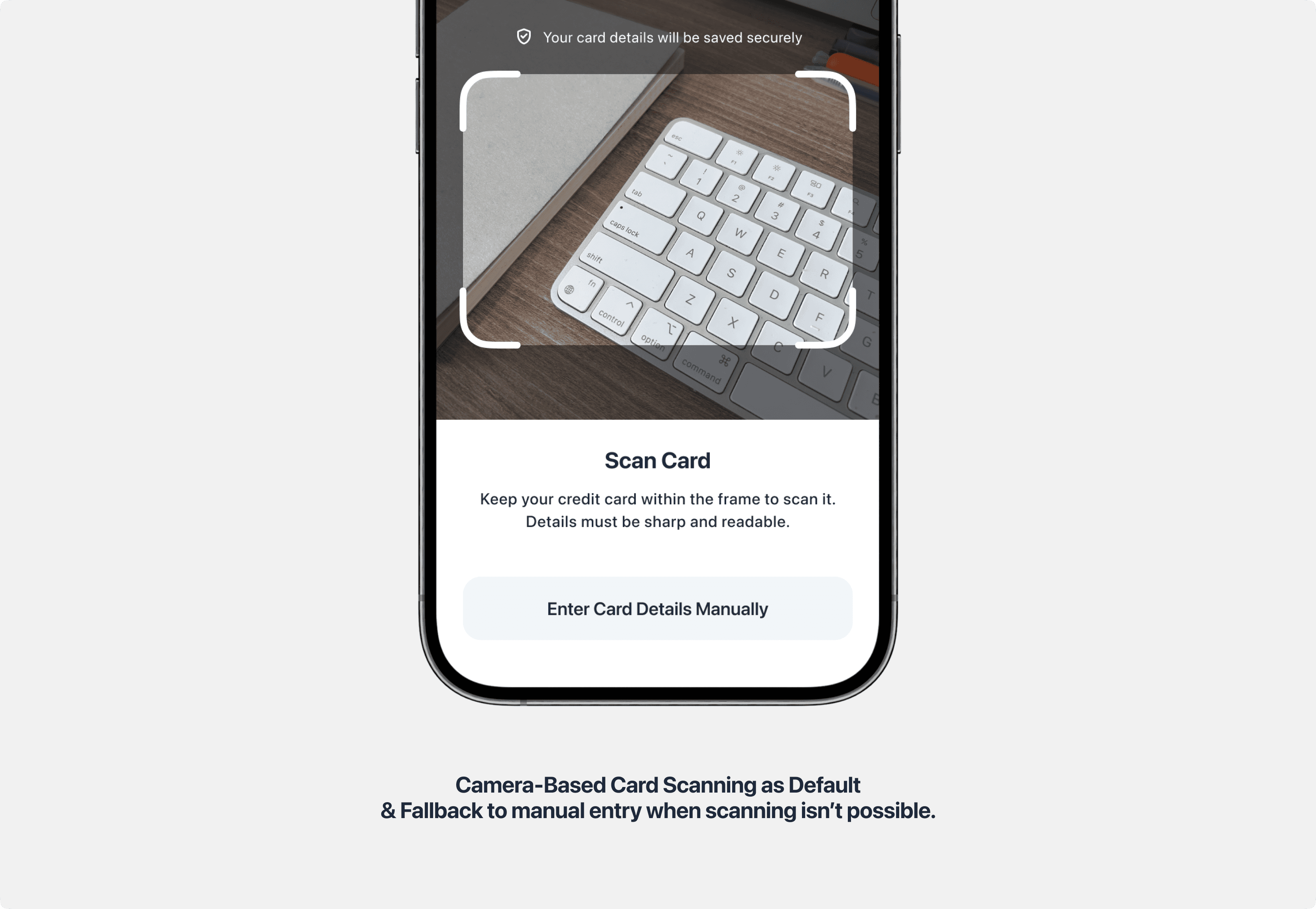 Linking a card should be fast, secure, and effortless—but many users hesitate due to security concerns or cumbersome input fields. To solve this, we redesigned the card-linking flow, prioritizing camera-based card scanning as the default method while offering manual entry as a fallback.