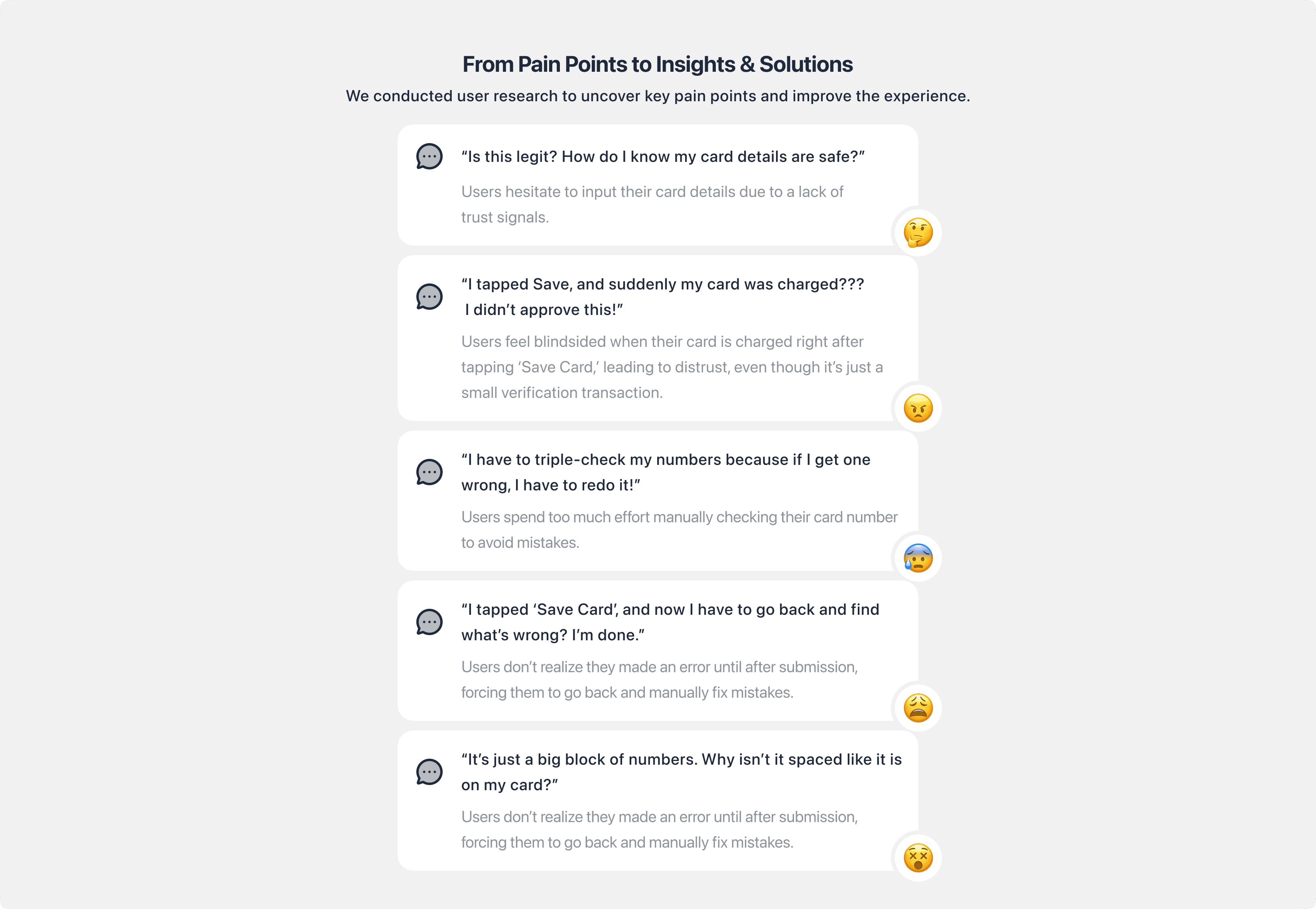 • Without clear security indicators, users felt uneasy about storing their card details.
